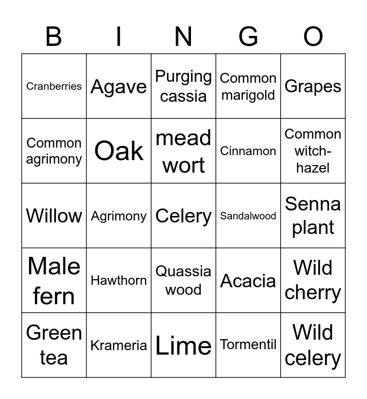 This bingo card has 25 words: Hawthorn, Lime, mead wort, Green tea, Grapes, Cranberries, Common agrimony, Agave, Sandalwood, Quassia wood, Cinnamon, Willow, Acacia, Wild cherry, Oak, Wild celery, Senna plant, Purging cassia, Common witch-hazel, Agrimony, Celery, Krameria, Male fern, Common marigold and Tormentil.
