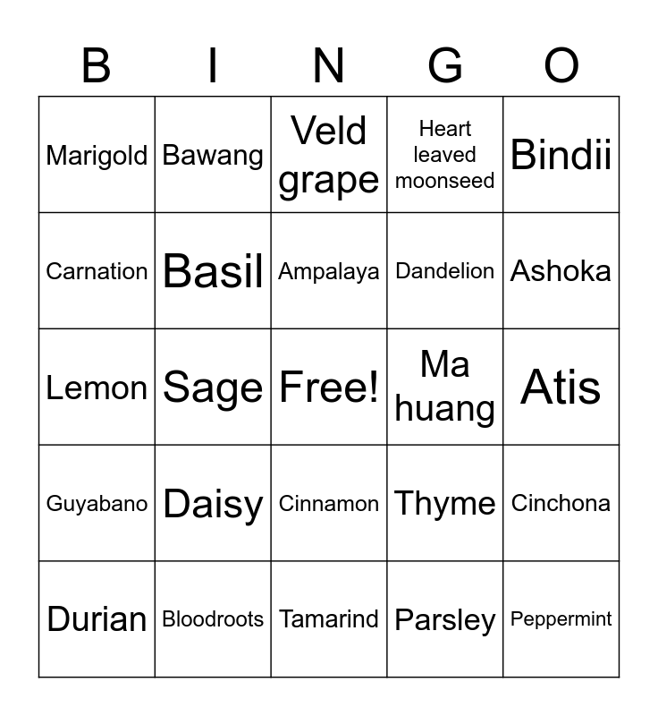 This bingo card has a free space and 24 words: Daisy, Bloodroots, Ampalaya, Durian, Bindii, Marigold, Carnation, Bawang, Ma huang, Cinnamon, Dandelion, Lemon, Thyme, Cinchona, Basil, Parsley, Atis, Veld grape, Ashoka, Sage, Peppermint, Guyabano, Heart leaved moonseed and Tamarind.