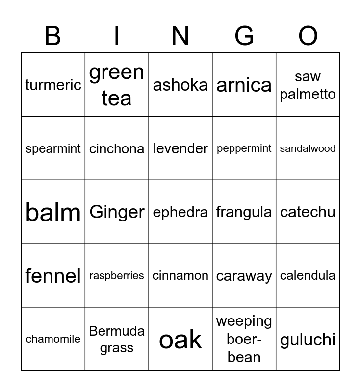 This bingo card has 30 words: Bermuda grass, Galangal, Ginger, sweet flag, turmeric, ashoka, cinchona, cinnamon, frangula, oak, catechu, ephedra, weeping boer-bean, guluchi, sandalwood, anise, caraway, fennel, raspberries, saw palmetto, balm, ginkgo, green tea, peppermint, spearmint, arnica, calendula, chamomile, levender and rosemary.