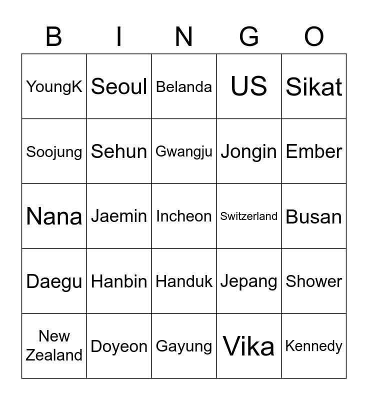 This bingo card has a free space and 24 words: Hanbin, Doyeon, Gwangju, New Zealand, Sikat, YoungK, Soojung, Seoul, Switzerland, Handuk, Jongin, Nana, Jepang, Shower, Sehun, Vika, Busan, Belanda, Ember, Jaemin, Kennedy, Daegu, US and Gayung.