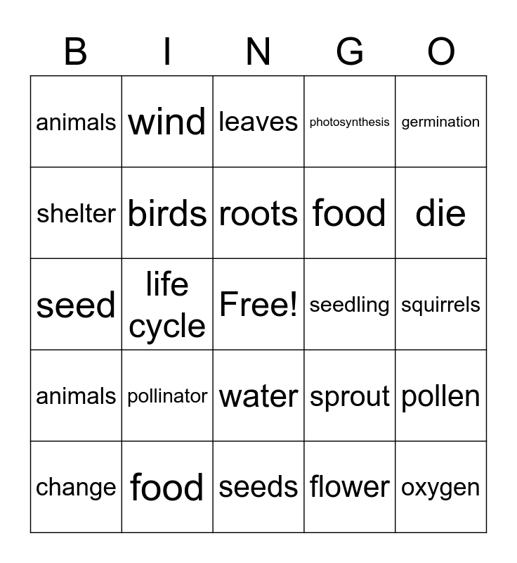 This bingo card has a free space and 26 words: water, flower, roots, food, germination, animals, shelter, wind, squirrels, sprout, food, seed, pollen, change, life cycle, vegetables, photosynthesis, animals, leaves, oxygen, die, seeds, seedling, pollinator, birds and stem.