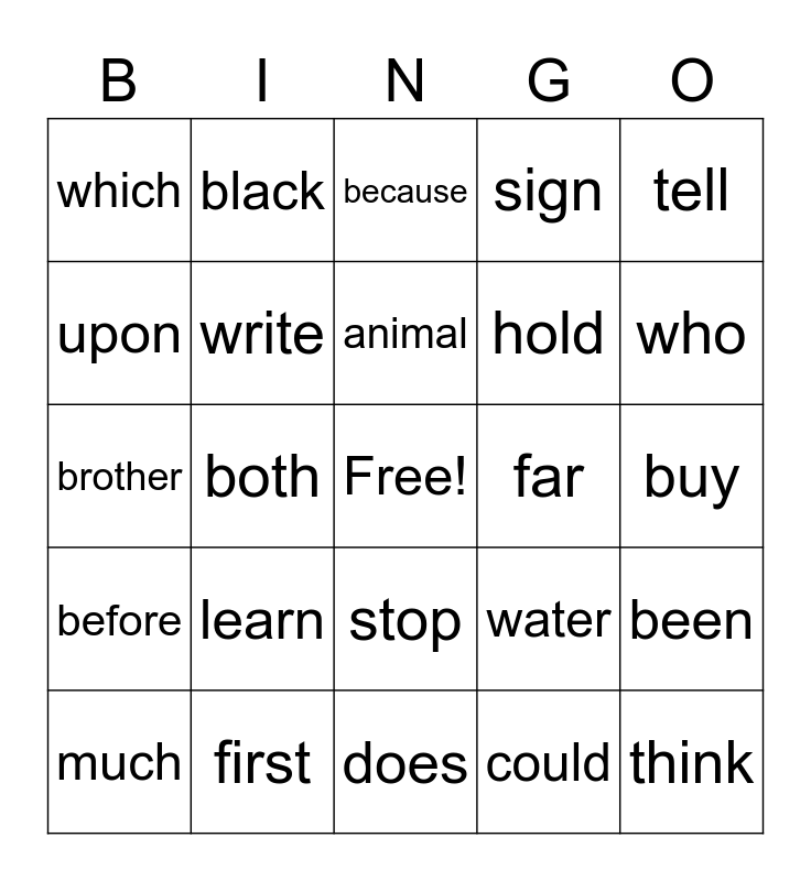 This bingo card has a free space and 24 words: learn, first, animal, much, tell, which, upon, black, far, stop, hold, brother, water, been, write, could, buy, because, who, both, think, before, sign and does.
