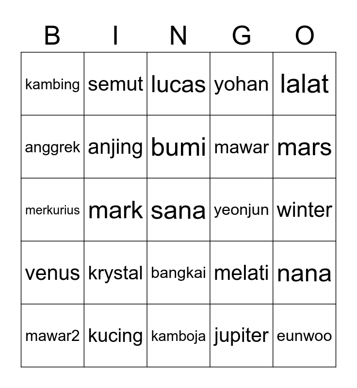 This bingo card has a free space and 24 words: krystal, kucing, bumi, mawar2, lalat, kambing, anggrek, semut, yeonjun, bangkai, mawar, merkurius, melati, nana, anjing, jupiter, winter, lucas, mars, mark, eunwoo, venus, yohan and kamboja.