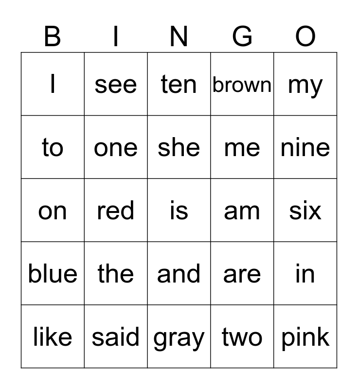 This bingo card has a free space and 24 words: the, said, she, like, my, I, to, see, am, and, me, on, are, in, one, two, six, ten, nine, red, pink, blue, brown and gray.
