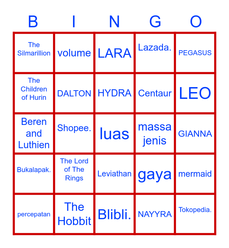 This bingo card has a free space and 24 words: The Lord of The Rings, The Hobbit, HYDRA, percepatan, PEGASUS, The Silmarillion, The Children of Hurin, volume, massa jenis, Leviathan, Centaur, Beren and Luthien, gaya, mermaid, DALTON, NAYYRA, GIANNA, LARA, LEO, Shopee., Tokopedia., Bukalapak., Lazada. and Blibli..