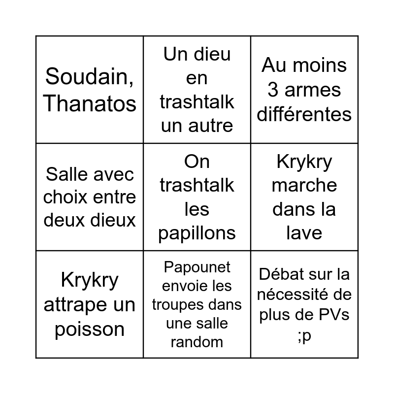 This bingo card has 9 words: Krykry attrape un poisson, Au moins 3 armes différentes, Un dieu en trashtalk un autre, Salle avec choix entre deux dieux, Soudain, Thanatos, Krykry marche dans la lave, On trashtalk les papillons, Débat sur la nécessité de plus de PVs ;p and Papounet envoie les troupes dans une salle random.