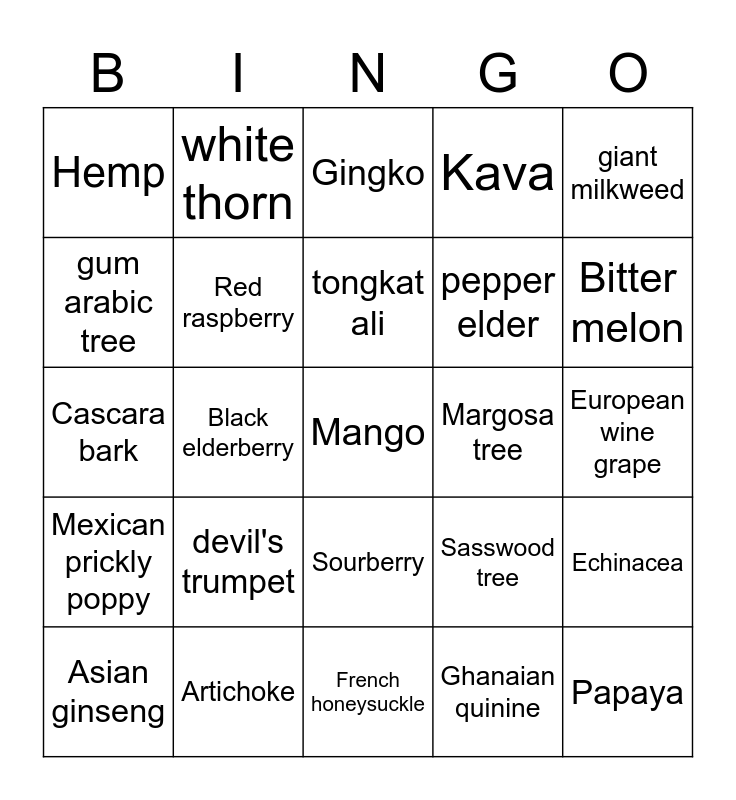 This bingo card has 30 words: Artichoke, Baobab tree, Black elderberry, French honeysuckle, Hemp, Gingko, Red raspberry, Sourberry, Margosa tree, French honeysuckle, European wine grape, Mango, Ghanaian quinine, Papaya, Bitter melon, malaysian ginseng, Sasswood tree, Mexican prickly poppy, devil's trumpet, giant milkweed, Cascara bark, African cherry, white thorn, pepper elder, gum arabic tree, Kava, Echinacea, Asian ginseng, tongkat ali and Ginger.