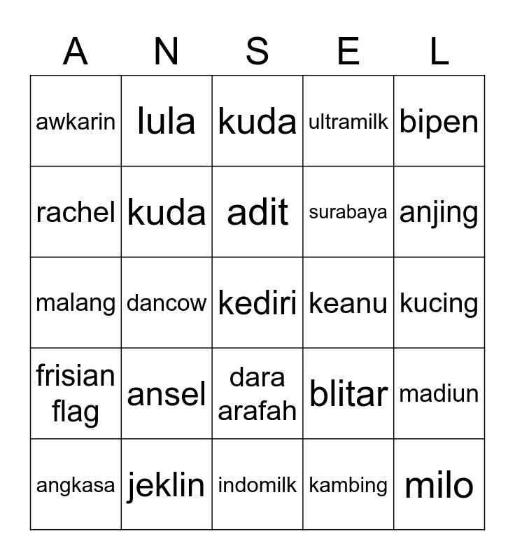 This bingo card has a free space and 24 words: ansel, jeklin, adit, angkasa, bipen, awkarin, rachel, lula, keanu, dara arafah, surabaya, malang, blitar, madiun, kuda, kambing, kucing, kuda, anjing, dancow, milo, frisian flag, ultramilk and indomilk.