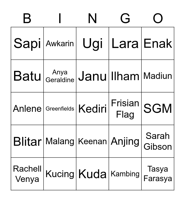 This bingo card has a free space and 24 words: Malang, Kucing, Janu, Rachell Venya, Enak, Sapi, Batu, Awkarin, Frisian Flag, Keenan, Ilham, Anlene, Anjing, Sarah Gibson, Anya Geraldine, Kambing, SGM, Ugi, Madiun, Greenfields, Tasya Farasya, Blitar, Lara and Kuda.