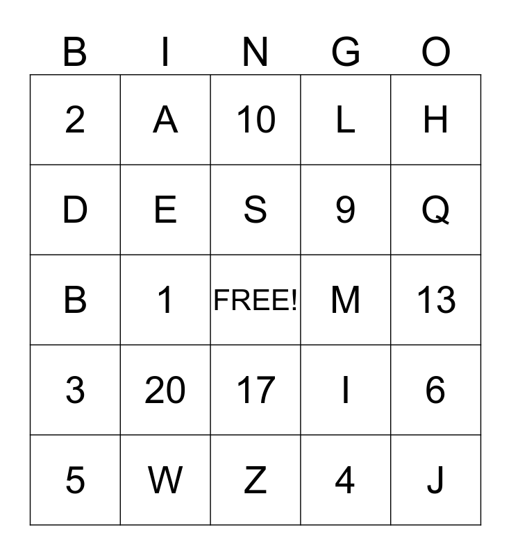 This bingo card has a free space and 24 words: 20, W, S, 5, H, 2, D, A, M, 17, 9, B, I, 6, E, 4, 13, 10, Q, 1, J, 3, L and Z.