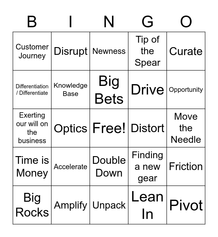 This bingo card has a free space and 24 words: Accelerate, Amplify, Big Bets, Big Rocks, Curate, Customer Journey, Differentiation / Differentiate, Disrupt, Distort, Double Down, Drive, Exerting our will on the business, Finding a new gear, Friction, Knowledge Base, Lean In, Move the Needle, Newness, Opportunity, Optics, Pivot, Time is Money, Tip of the Spear and Unpack.
