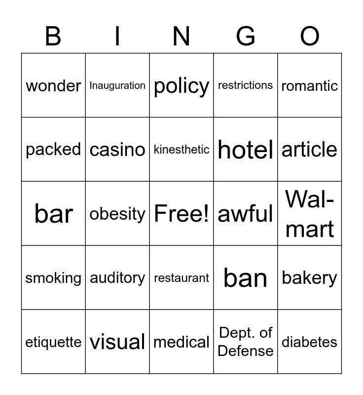 This bingo card has a free space and 24 words: auditory, visual, kinesthetic, etiquette, romantic, wonder, packed, Inauguration, awful, restaurant, hotel, bar, ban, bakery, casino, Dept. of Defense, Wal-mart, policy, article, obesity, diabetes, smoking, restrictions and medical.