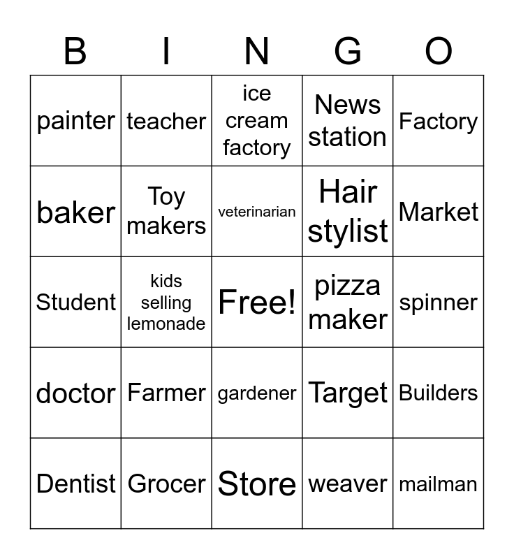 This bingo card has a free space and 24 words: Farmer, Grocer, veterinarian, Dentist, Factory, painter, baker, teacher, pizza maker, gardener, Hair stylist, Student, Target, Builders, Toy makers, weaver, spinner, ice cream factory, Market, kids selling lemonade, mailman, doctor, News station and Store.