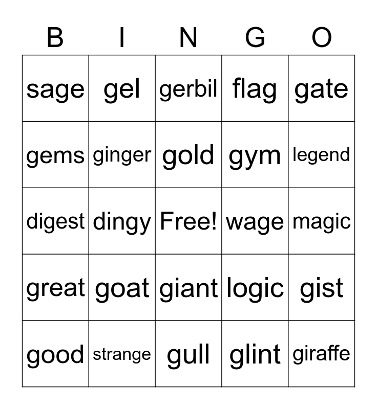 This bingo card has a free space and 25 words: goat, gull, gold, good, gate, sage, gems, gel, wage, giant, gym, digest, logic, gist, ginger, digit, magic, gerbil, legend, dingy, giraffe, strange, great, flag and glint.