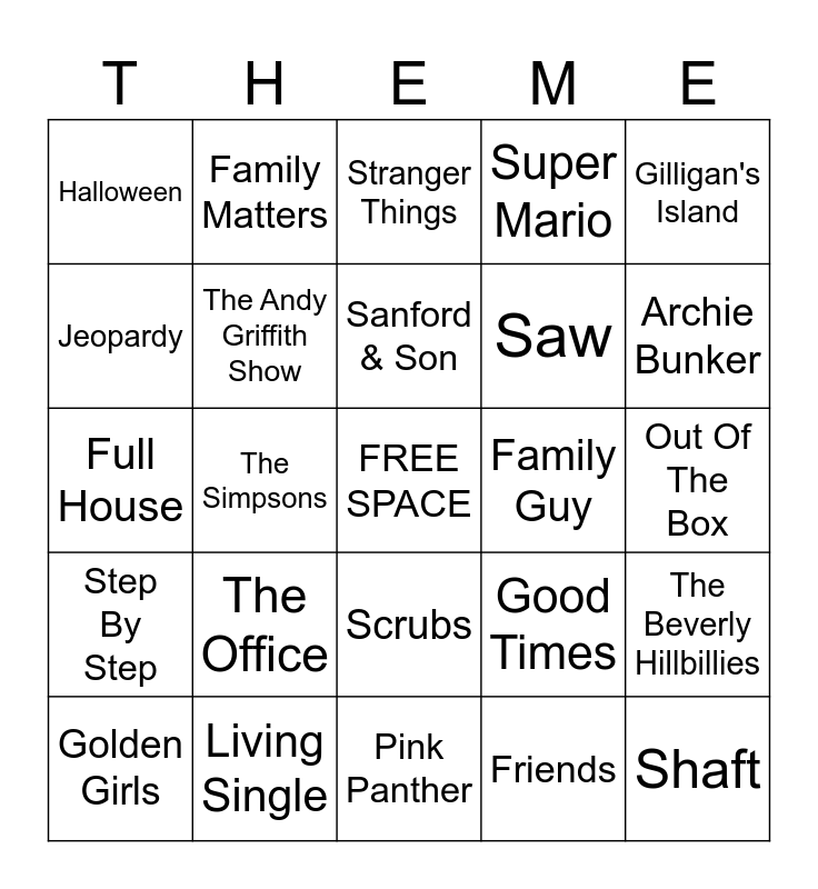 This bingo card has a free space and 53 words: Fresh Prince, Shaft, Mission Impossible, Friends, The Office, The Jeffersons, Family Matters, The Flintstones, Jeopardy, The Price Is Right, The Andy Griffith Show, The Brady Bunch, The Beverly Hillbillies, Good Times, The Sopranos, Golden Girls, Sanford & Son, Family Guy, The Addams Family, Gilligan's Island, The Simpsons, Jaws, Saw, Halloween, Big Bang Theory, Living Single, Law & Order, Star Wars, Batman, Archie Bunker, Happy Days, The Love Boat, Cops, LOVE ISLAND, Ghostbusters, Austin Powers, Super Mario, Pink Panther, Stranger Things, Barney, Family Feud, Blue's Clues, Out Of The Box, NFL, NBA, Scrubs, Dukes Of Hazard, Cheers, Full House, Step By Step, Bob's Burgers, TMNT and Saved By The Bell.
