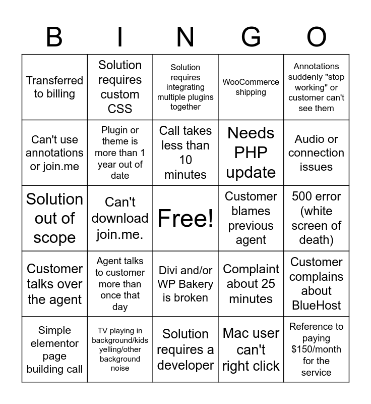 This bingo card has a free space and 24 words: Agent talks to customer more than once that day, TV playing in background/kids yelling/other background noise, Call takes less than 10 minutes, Simple elementor page building call, Annotations suddenly "stop working" or customer can't see them, Transferred to billing, Can't use annotations or join.me, Solution requires custom CSS, Customer blames previous agent, Divi and/or WP Bakery is broken, Needs PHP update, Solution out of scope, Complaint about 25 minutes, Customer complains about BlueHost, Plugin or theme is more than 1 year out of date, Mac user can't right click, 500 error (white screen of death), Solution requires integrating multiple plugins together, Audio or connection issues, Can't download join.me., Reference to paying $150/month for the service, Customer talks over the agent, WooCommerce shipping and Solution requires a developer.