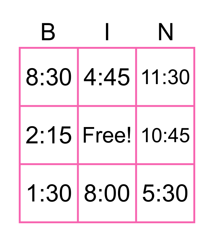 This bingo card has a free space and 14 words: 12:00, 3:00, 1:30, 4:45, 2:15, 5:30, 6:45, 7:15, 8:00, 8:30, 9:15, 10:45, 11:30 and 11:45.