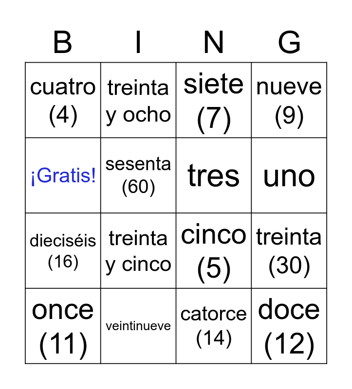 This bingo card has 41 words: dos, cinco (5), trece (13), tres, seis (6), diez (10), uno, treinta y uno, ¡Gratis!, doce (12), treinta (30), nueve (9), once (11), catorce (14), veintinueve, diecinueve, dieciocho (18), cuatro (4), quince (15), siete (7), veintitrés, ocho (8), veinticuatro (24), dieciséis (16), diecisiete (17), treinta y dos, treinta y tres, treinta y cuatro, treinta y cinco, treinta y seis, treinta y siete, treinta y ocho, treinta y nueve, cuarenta (40), cincuenta (50), sesenta (60), setenta (70), ochenta (80), noventa (90), cien (100) and cero (0).
