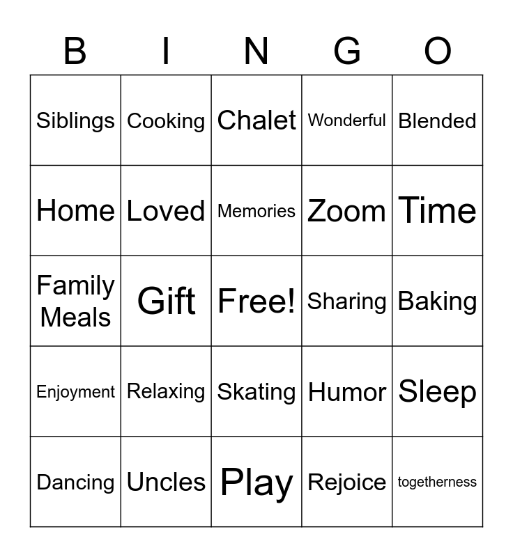 This bingo card has a free space and 50 words: Family, togetherness, Happy, Play, Relaxing, Hiking, Cooking, Harmony, Home, Cottage, Loved, Wonderful, Sleep, Humor, Photos, Family Tree, Memories, Sharing, Friendship, Blended, Gift, Rejoice, Siblings, Zoom, Skating, Company, Time, Sharing, Chalet, Skating, Skiing, Tobogganing, Grand parents, Aunts, Uncles, Board Games, Visiting, Crafts, Coffee Chats, Baking, Snow Shoeing, Gatherings, Reunions, Movie Night, Dancing, Family Meals, Bonding, Laughter, Enjoyment and Excitement.