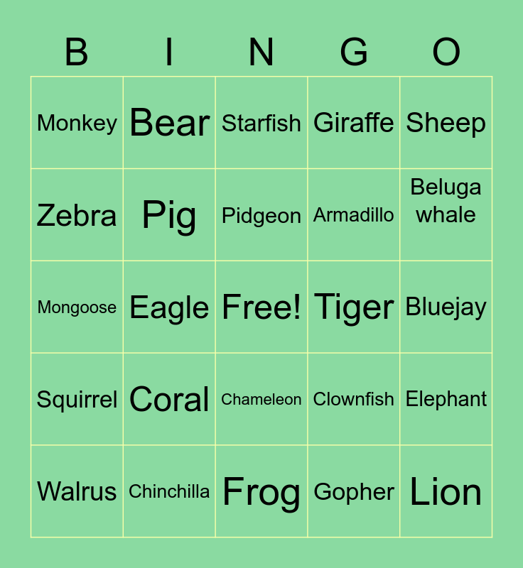 This bingo card has a free space and 34 words: Groundhog, Gopher, Rabbit, Panda, Squirrel, Pig, Sheep, Walrus, Bear, Owl, Pidgeon, Starfish, Red panda, Meerkat, Tiger, Beluga whale, Chinchilla, Mongoose, Coral, Clownfish, Chameleon, Gecko, Monkey, Bluejay, Frog, Lion, Giraffe, Toucan, Armadillo, Zebra, Antelope, Eagle, Elephant and Fox.