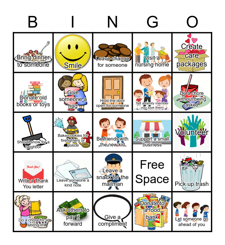 This bingo card has 24 images and 25 words: Leave someone a kind note, Give a compliment, Hold the door open for someone, Do a chore for a sibling, Create care packages, Bring dinner to someone, Donate old books or toys, Smile, Support a small business, Leave a snack for the mailman, Tell a family member you love them, Shovel snow for a neighbor, Free Space, Pick up trash, Give someone a hug, Let someone go ahead of you, Volunteer, Leave change for someone, Do a chore without being asked, Bake cookies for firefighters or police, Be friends with the new kid, Ask others to pay it forward, Write a Thank You letter, Visit a nursing home and Donate to a food bank.