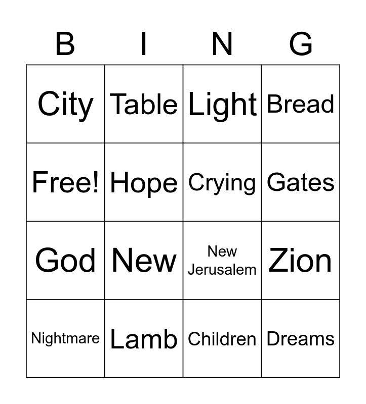 This bingo card has 16 words: Lamb, Zion, Light, City, God, Table, New Jerusalem, Children, Free!, Hope, Nightmare, Bread, New, Gates, Crying and Dreams.