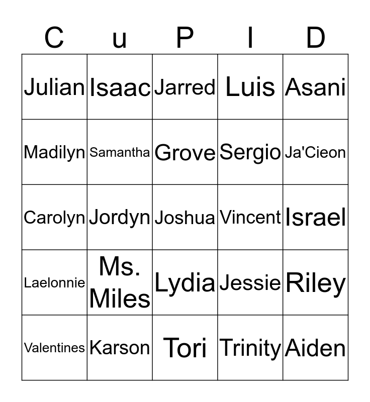 This bingo card has a free space and 24 words: Ms. Miles, Karson, Grove, Valentines, Asani, Julian, Madilyn, Isaac, Vincent, Lydia, Sergio, Carolyn, Jessie, Riley, Samantha, Trinity, Israel, Jarred, Ja'Cieon, Jordyn, Aiden, Laelonnie, Luis and Tori.