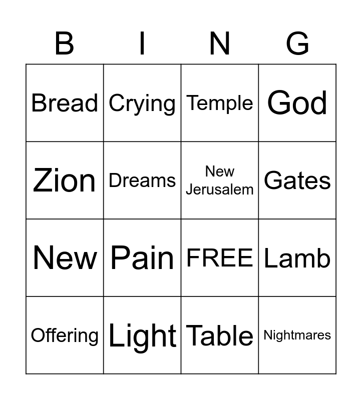 This bingo card has 16 words: Light, Lamb, Temple, Bread, New, Crying, FREE, Table, Zion, Dreams, Offering, God, Pain, Gates, New Jerusalem and Nightmares.
