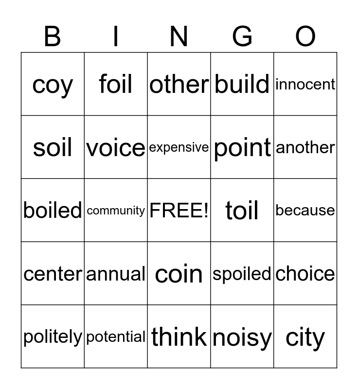 This bingo card has a free space and 24 words: annual, potential, expensive, politely, innocent, coy, soil, foil, toil, coin, point, boiled, spoiled, choice, voice, noisy, because, other, another, community, city, center, build and think.