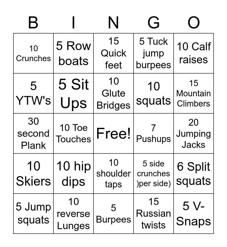 This bingo card has a free space and 24 words: 10 hip dips, 10 reverse Lunges, 10 Glute Bridges, 5 Jump squats, 10 Calf raises, 10 Crunches, 5 YTW's, 5 Row boats, 7 Pushups, 10 shoulder taps, 10 squats, 30 second Plank, 5 side crunches )per side), 6 Split squats, 5 Sit Ups, 15 Russian twists, 20 Jumping Jacks, 15 Quick feet, 15 Mountain Climbers, 10 Toe Touches, 5 V- Snaps, 10 Skiers, 5 Tuck jump burpees and 5 Burpees.