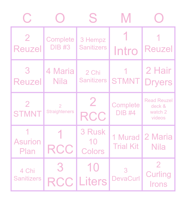 This bingo card has a free space and 24 words: 1 RCC, 3 RCC, 2 Chi Sanitizers, 4 Chi Sanitizers, 1 Reuzel, 2 Reuzel, 3 Reuzel, Complete DIB #3, Complete DIB #4, 3 Rusk 10 Colors, 1 STMNT, 2 STMNT, 1 Murad Trial Kit, 2 Maria Nila, 4 Maria Nila, 3 DevaCurl, Read Reuzel deck & watch 2 videos, 3 Hempz Sanitizers, 2 Hair Dryers, 2 Straighteners, 2 Curling Irons, 1 Asurion Plan, 1 Intro and 10 Liters.