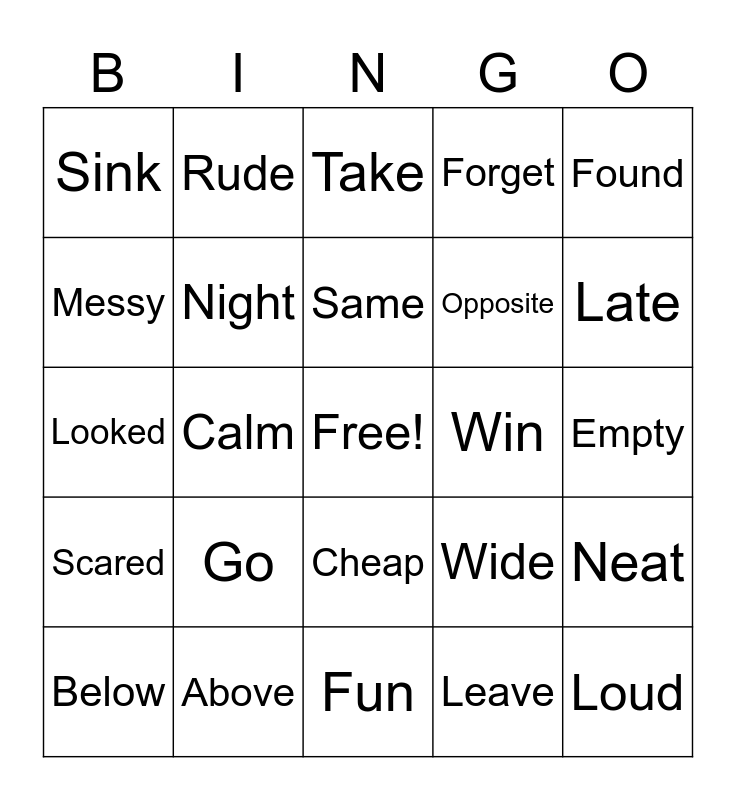 This bingo card has a free space and 24 words: Go, Above, Same, Below, Found, Sink, Messy, Rude, Win, Cheap, Opposite, Looked, Wide, Neat, Night, Leave, Empty, Take, Late, Calm, Loud, Scared, Forget and Fun.