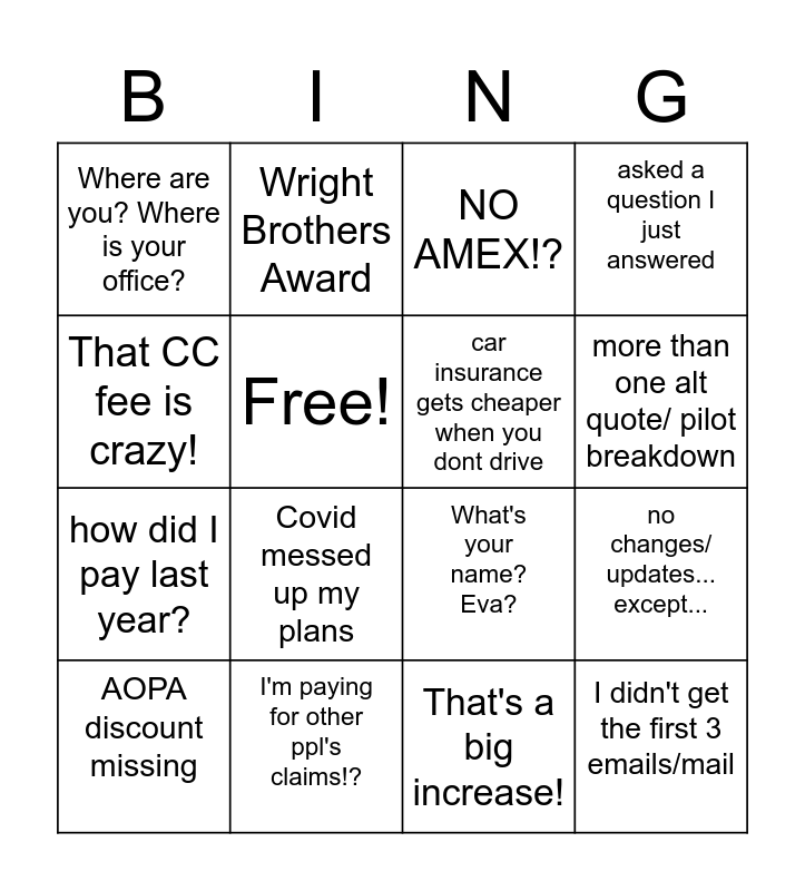 This bingo card has 16 words: I'm paying for other ppl's claims!?, no changes/ updates... except..., NO AMEX!?, Where are you? Where is your office?, how did I pay last year?, Wright Brothers Award, What's your name? Eva?, That's a big increase!, That CC fee is crazy!, Free!, AOPA discount missing, asked a question I just answered, Covid messed up my plans, more than one alt quote/ pilot breakdown, car insurance gets cheaper when you dont drive and I didn't get the first 3 emails/mail.