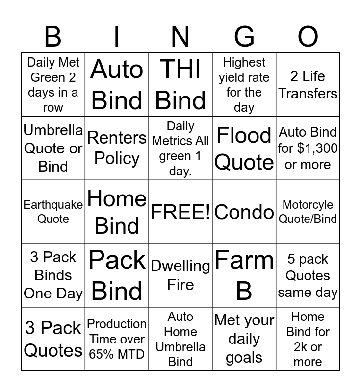This bingo card has a free space and 24 words: Pack Bind, Production Time over 65% MTD, Daily Metrics All green 1 day., 3 Pack Quotes, 2 Life Transfers, Daily Met Green 2 days in a row, Umbrella Quote or Bind, Auto Bind, Condo, Dwelling Fire, Flood Quote, Earthquake Quote, Farm B, 5 pack Quotes same day, Renters Policy, Met your daily goals, Motorcyle Quote/Bind, THI Bind, Auto Bind for $1,300 or more, Home Bind, Home Bind for 2k or more, 3 Pack Binds One Day, Highest yield rate for the day and Auto Home Umbrella Bind.