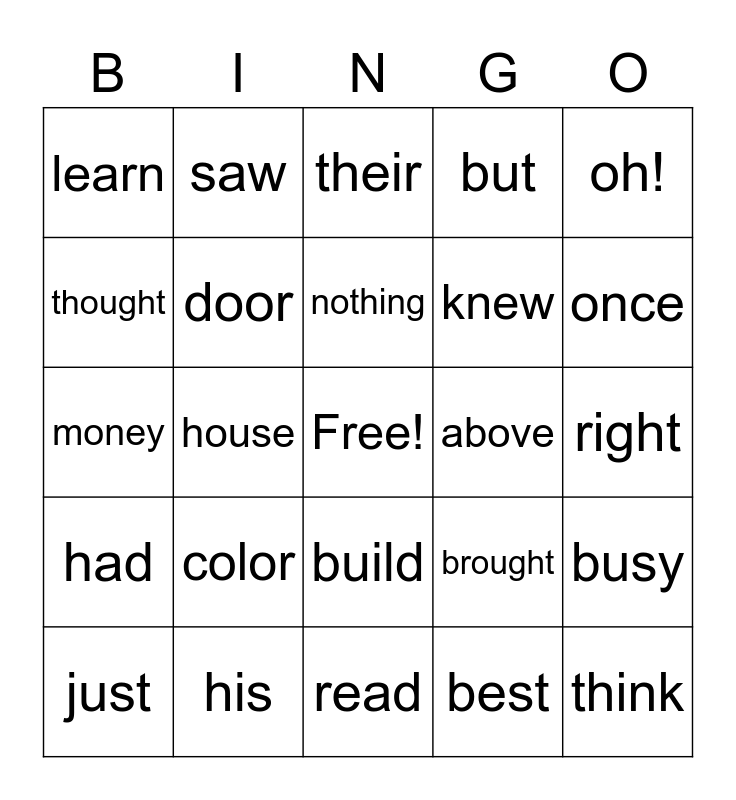 This bingo card has a free space and 25 words: color, read, nothing, just, oh!, learn, thought, saw, above, build, knew, money, brought, busy, door, enough, right, their, once, house, think, his, had, but and best.