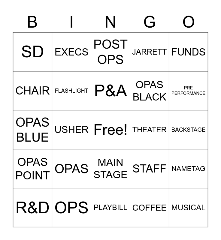 This bingo card has a free space and 24 words: OPAS, OPS, P&A, R&D, FUNDS, SD, CHAIR, EXECS, THEATER, MAIN STAGE, OPAS BLACK, OPAS BLUE, STAFF, NAMETAG, FLASHLIGHT, COFFEE, BACKSTAGE, POST OPS, PRE PERFORMANCE, USHER, MUSICAL, OPAS POINT, JARRETT and PLAYBILL.