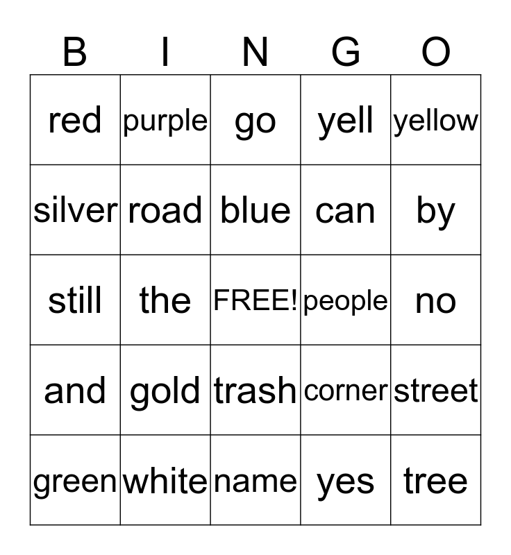 This bingo card has a free space and 24 words: gold, white, blue, green, yellow, red, silver, purple, people, trash, can, still, corner, street, road, yes, no, go, by, the, tree, and, yell and name.