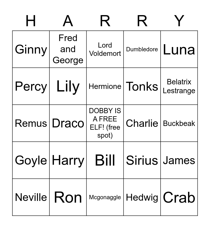 This bingo card has a free space and 24 words: Harry, Ron, Hermione, Neville, Luna, Ginny, Percy, Fred and George, Charlie, Bill, Tonks, Remus, Sirius, James, Lily, Hedwig, Buckbeak, Lord Voldemort, Belatrix Lestrange, Draco, Crab, Goyle, Dumbledore and Mcgonaggle.