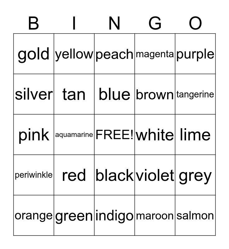 This bingo card has a free space and 24 words: red, green, blue, orange, purple, gold, silver, yellow, white, black, brown, pink, violet, grey, tan, maroon, lime, peach, tangerine, aquamarine, salmon, periwinkle, magenta and indigo.