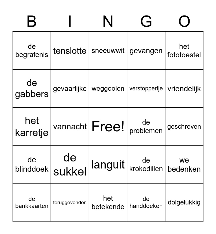 This bingo card has a free space and 120 words: de beloning, de kleding, de ontdekking, de richting, de spanning, angstig, gevangen, ik bedank, we bedenken, enkel, de herinnering, de lading, de oplossing, plotseling, de verkenning, belangrijke, languit, de rechtbank, enkele, de zonsondergang, de bankkaarten, sneeuwwit, het vissersschip, we goochelen, de zeemeerminnen, de blinddoek, teruggevonden, weggelopen, ze loochenen, het programma, de handdoeken, vannacht, weggooien, meegemaakt, de lotto, de oppas, de villa, de goochelaar, de veearts, het tempo, de avonturen, ondersteboven, de boterhammen, de datum, de gaskamer, gezellig, helaas, de problemen, supergrote, de temperatuur, de overvallers, hij huppelde, de krokodillen, de krukken, de ontploffing, bestuderen, de pannenkoek, de spinnenwebben, de sterretjes, tenslotte, aangevallen, aanleggen, binnenste, geschrokken, de raketten, de gabbers, de bestemming, zij herinnerde, gewonnen, de mummie, het karretje, de nachtmerrie, verschillende, stoffig, ondertussen, het rapport, verstoppertje, de vriendinnen, dolgelukkig, de sukkel, de begrafenis, wij staren, tevreden, de krokodil, het huwelijk, de fantasie, het betekende, aangekomen, meegenomen, de juwelen, normale, geschreven, enorme, wij veroveren, het publiek, de resultaten, opgegeten, het fototoestel, zij amuseren, de supermarkt, eerlijk, heerlijk, natuurlijk, vrolijk, waarschijnlijk, gevaarlijke, lelijke, moeilijke, oneerlijke, wonderlijke, dadelijk, duidelijk, gemakkelijk, uiteindelijk, vriendelijk, afschuwelijke, belachelijke, mogelijke, vreselijke and verschrikkelijke.