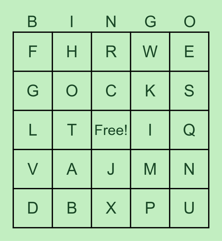 This bingo card has a free space and 24 words: A, B, C, D, E, F, G, H, I, J, K, L, M, N, O, P, Q, R, S, T, U, V, W and X.