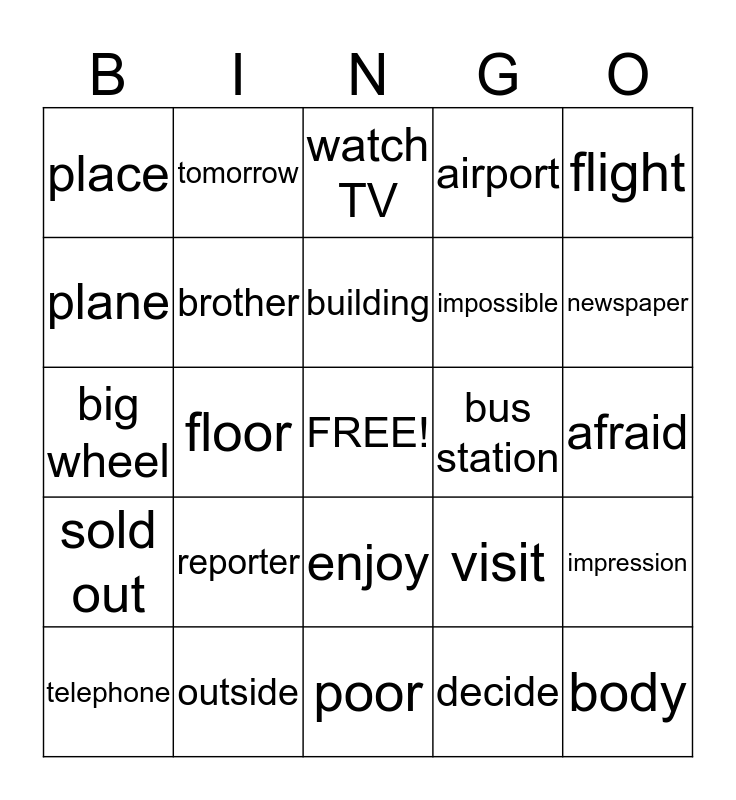 This bingo card has a free space and 95 words: English, violin, decide, famous, shopping centre, count, ticket, outside, bathroom, pencil, fast food, comic, High school, building, tonight, place, newspaper, collect, together, answer, Wednesday, reduction, shower, cheapest, airport, plane, pilot, impossible, exactly, traffic, reporter, magazine, owner, question, telephone, next week, poor, warehouse, big wheel, straight, impression, floor, enjoy, flight, visit, bus station, ferry, beautiful, kitchen, toilet, bedroom, downstairs, upstairs, hungry, really, orange, sandwich, coffee, of course, sister, brother, teacher, family, birthday, purple, dark blue, everything, football, watch TV, saxophone, silver, wings, body, rabbit, puppy, January, dress up, shoebox, finish, tomorrow, performance, leader, singer, only, afraid, sold out, horse, picture, holidays, website, organise, match, accent, apple and American.