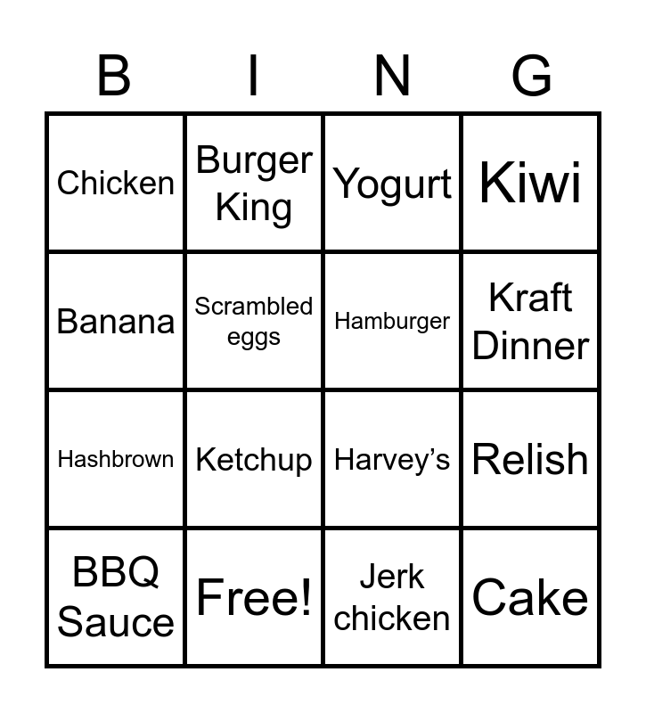 This bingo card has 25 words: Apple, Pizza, Kraft Dinner, Mango, Banana, Chicken, Scrambled eggs, Burger King, Free!, McDonalds, Hashbrown, Harvey’s, Fried Rice, Chocolate cake, Hamburger, Spaghetti &Meatball, Jerk chicken, Yogurt, Ketchup, Relish, BBQ Sauce, Alfredo, Cake, Kiwi and Shrimp.