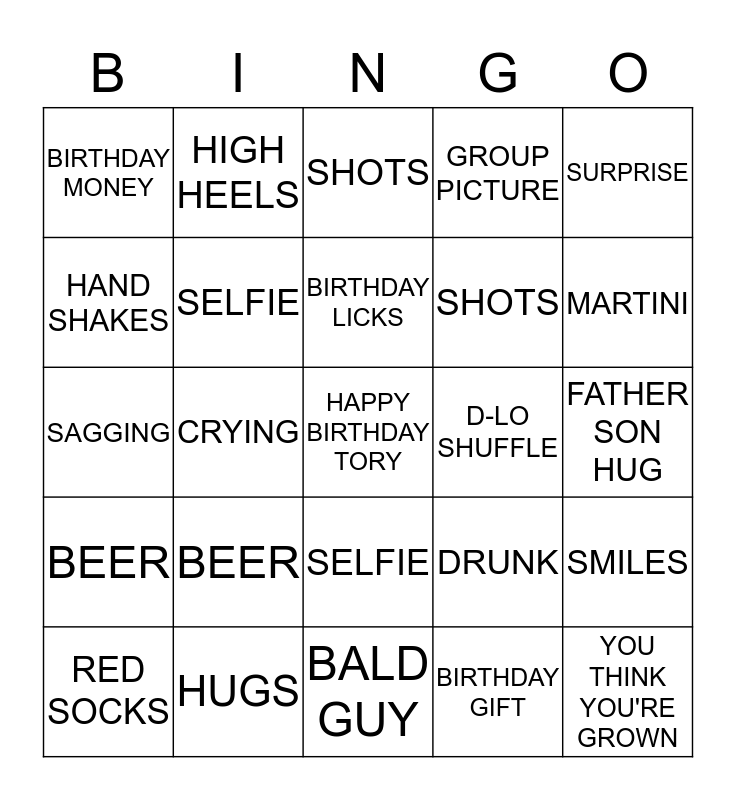 This bingo card has a free space and 24 words: BEER, HUGS, BIRTHDAY LICKS, RED SOCKS, SURPRISE, BIRTHDAY MONEY, HAND SHAKES, HIGH HEELS, D-LO SHUFFLE, SELFIE, SHOTS, SAGGING, DRUNK, SMILES, SELFIE, BIRTHDAY GIFT, FATHER SON HUG, SHOTS, MARTINI, CRYING, YOU THINK YOU'RE GROWN, BEER, GROUP PICTURE and BALD GUY.