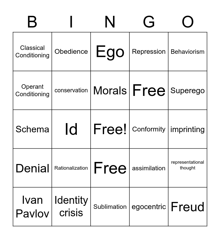 This bingo card has a free space and 24 words: Rationalization, Identity crisis, Morals, Ivan Pavlov, Behaviorism, Classical Conditioning, Operant Conditioning, Obedience, Conformity, Free, Free, Schema, assimilation, representational thought, conservation, egocentric, imprinting, Ego, Superego, Id, Freud, Denial, Repression and Sublimation.