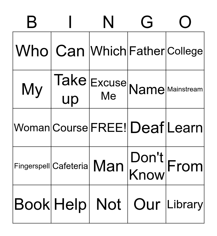 This bingo card has a free space and 24 words: Cafeteria, Help, Excuse Me, Book, College, Who, My, Can, Deaf, Man, Name, Woman, Don't Know, From, Take up, Our, Learn, Which, Mainstream, Course, Library, Fingerspell, Father and Not.
