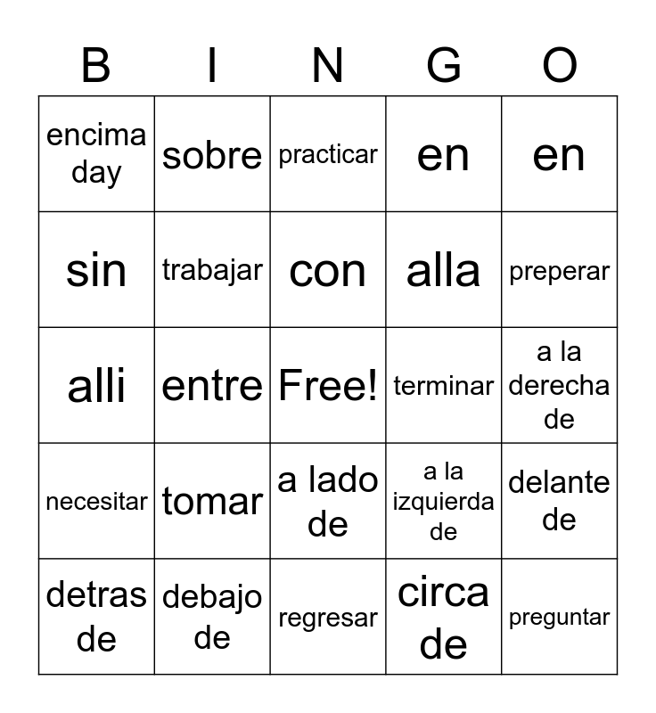 This bingo card has a free space and 26 words: a lado de, circa de, con, debajo de, en, encima day, sin, sobre, a la derecha de, a la izquierda de, alla, alli, delante de, detras de, entre, lejos de, en, necesitar, practicar, preguntar, preperar, regresar, terminar, tomar, trabajar and viajar.