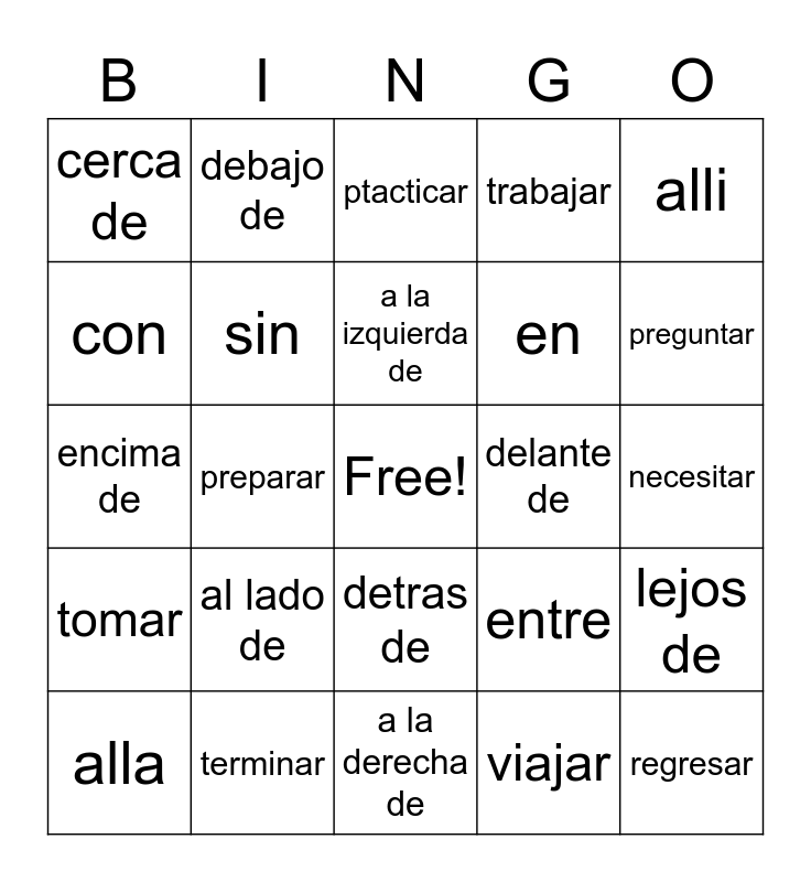 This bingo card has a free space and 25 words: al lado de, a la derecha de, a la izquierda de, alla, alli, cerca de, con, debajo de, delante de, detras de, en, encima de, entre, lejos de, sin, sobre, necesitar, ptacticar, preguntar, preparar, regresar, terminar, tomar, trabajar and viajar.