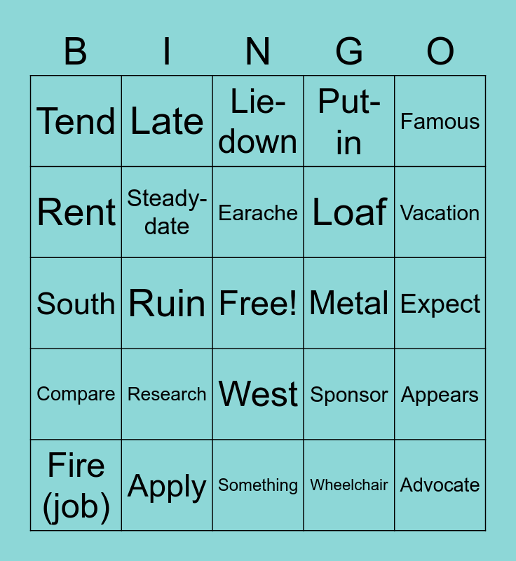 This bingo card has a free space and 56 words: Damage, Doubt, East, Famous, Fire (job), Frustrate, Earache, Hope, Expect, Laid-up, Late, Hit, Metal, Nab, Get-ahold-of, North, Lie-down, Put-in, Radio, Rent, Research, Nothing-to-it, Loaf, Vacation, Rubber, Ruin, Retire, Seem, Appears, Shot-up, Become-successful, Spoil, Someone, Alone, South, Steady-date, Something, Sponsor, Advocate, Tend, Tournament, Support, Wheelchair, Wood, Wrong, Apply, West, Candidate, Argue, Quarrel, Broke, Volunteer, Caption, Subtitles, Compare and But.