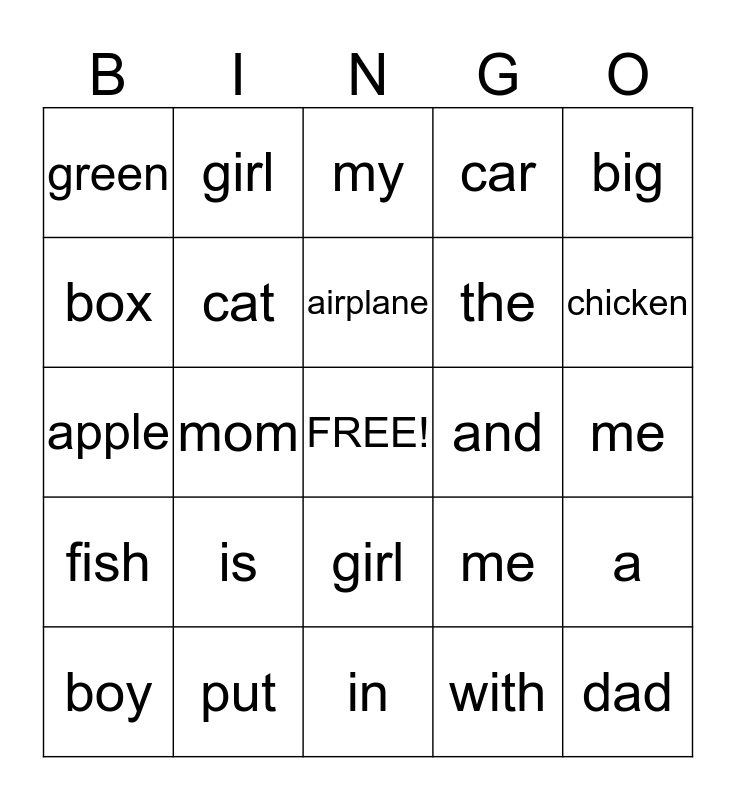 This bingo card has a free space and 24 words: is, put, airplane, boy, big, green, box, girl, and, girl, the, apple, me, a, cat, with, me, my, chicken, mom, dad, fish, car and in.